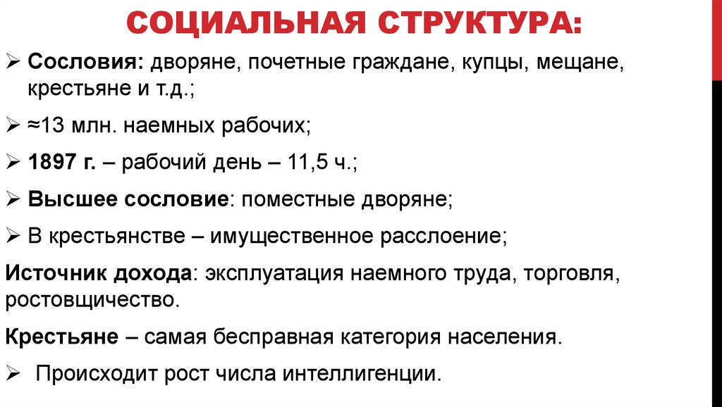 СОЦИАЛЬНАЯ СТРУКТУРА:Сословия: дворяне, почетные граждане, купцы, мещане,