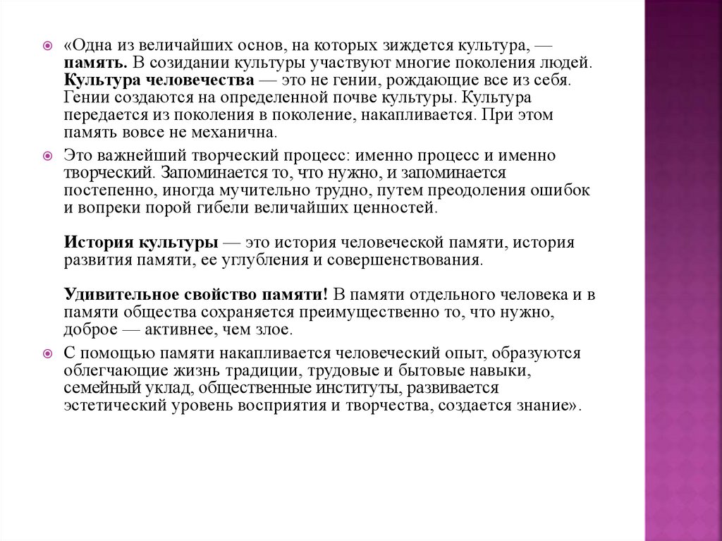 «Одна из величайших основ, на которых зиждется культура, —память. В созидании культуры участвуют многие поколения людей.