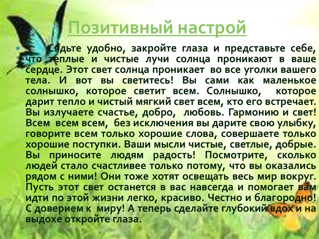 Позитивный настройСядьте удобно, закройте глаза и представьте себе,