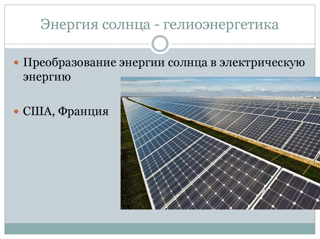 Энергия солнца - гелиоэнергетикаПреобразование энергии солнца в электрическую