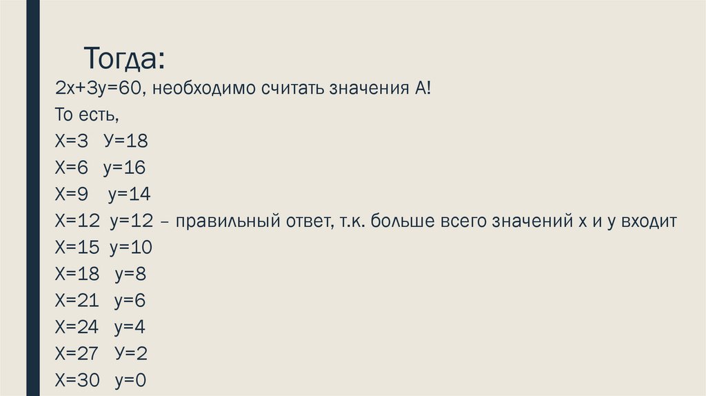 Х=12 у=12 – правильный ответ, т.к. больше всего значений х и у входит