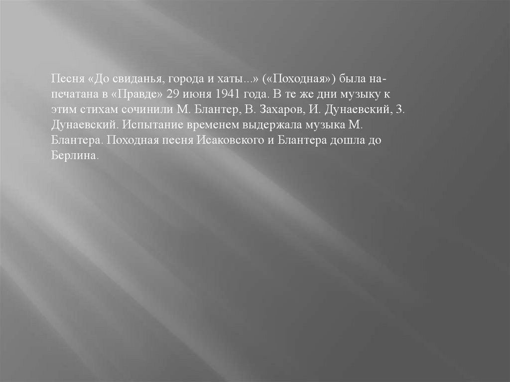 Песня «До свиданья, города и хаты...» («Походная») была напечатана в «Правде» 29 июня 1941 года. В те же дни музыку кэтим стихам сочинили М. Блантер, В. Захаров, И. Дунаевский, 3.