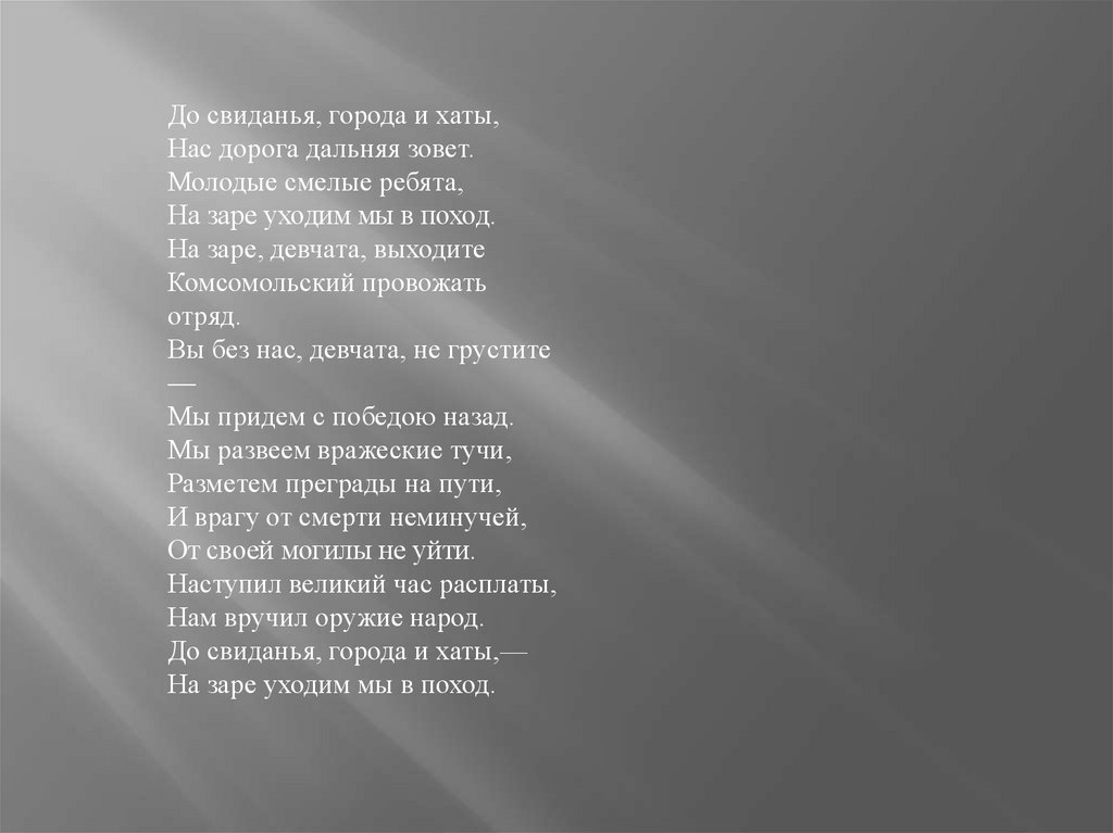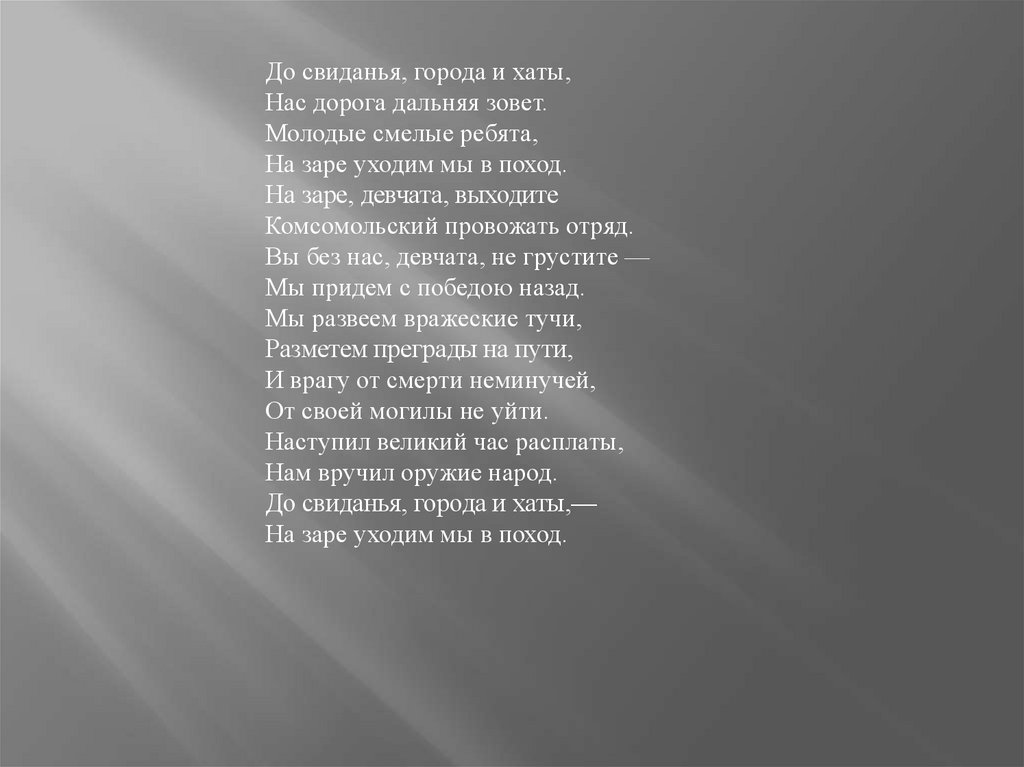 До свиданья, города и хаты,Нас дорога дальняя зовет.