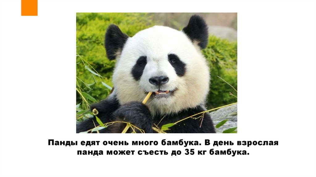 Панды едят очень много бамбука. В день взрослаяпанда может съесть до 35 кг бамбука.