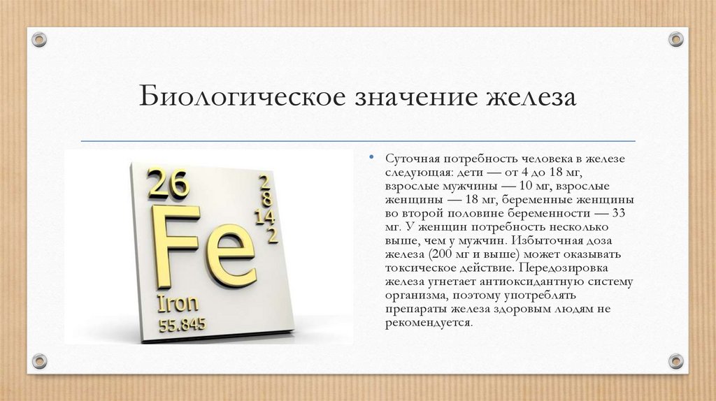 Биологическое значение железа• Суточная потребность человека в железе