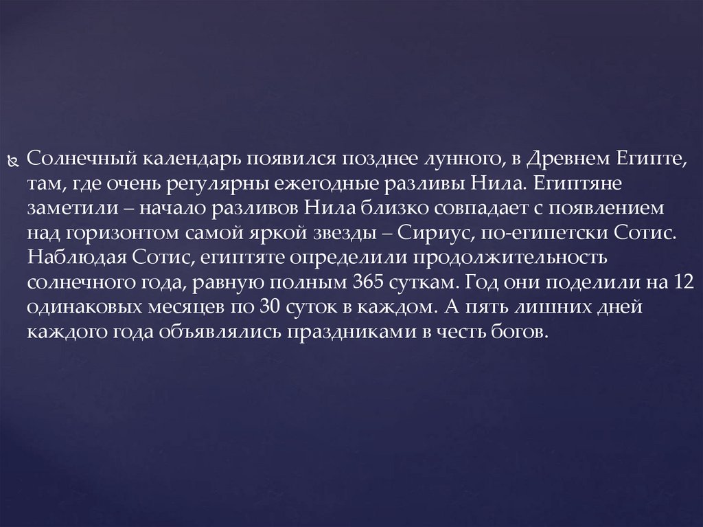 Солнечный календарь появился позднее лунного, в Древнем Египте,там, где очень регулярны ежегодные разливы Нила. Египтяне
