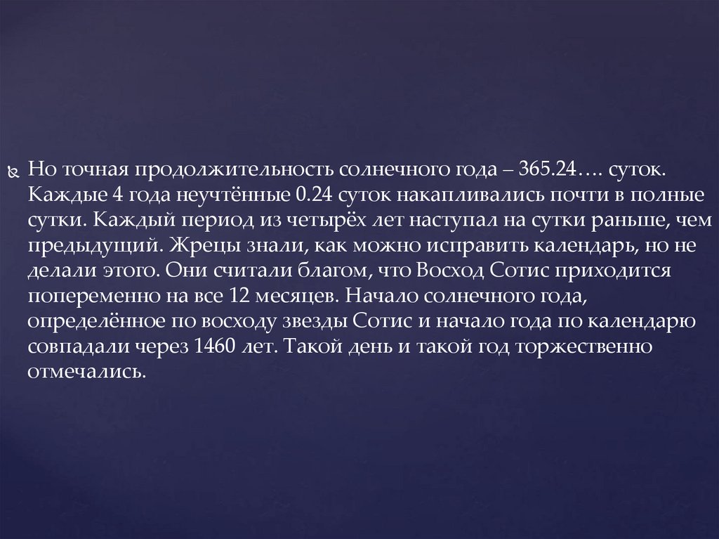 Но точная продолжительность солнечного года – 365.24…. суток.Каждые 4 года неучтённые 0.24 суток накапливались почти в полные