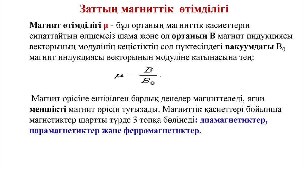 Заттың магниттiк өтімділігіМагнит өтiмдiлiгi μ - бұл ортаның магниттiк қасиеттерiн