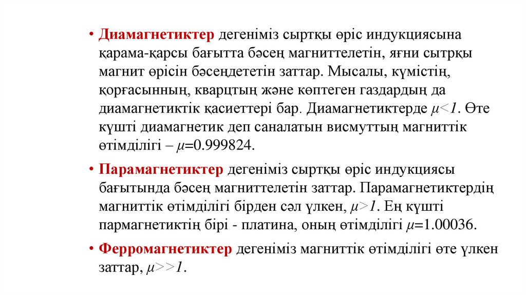 • Диамагнетиктер дегенiмiз сыртқы өрiс индукциясынақарама-қарсы бағытта бәсең магниттелетiн, яғни сытрқы