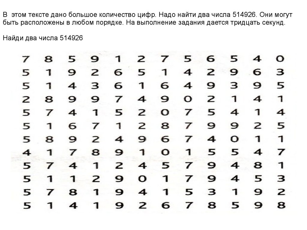 В этом тексте дано большое количество цифр. Надо найти два числа 514926. Они могутбыть расположены в любом порядке. На выполнение задания дается тридцать секунд.