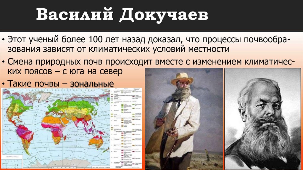 Василий Докучаев• Этот ученый более 100 лет назад доказал, что процессы почвообразования зависят от климатических условий местности