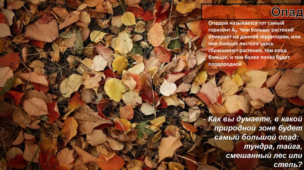 Опадом называется тот самыйгоризонт А0. Чем больше растений