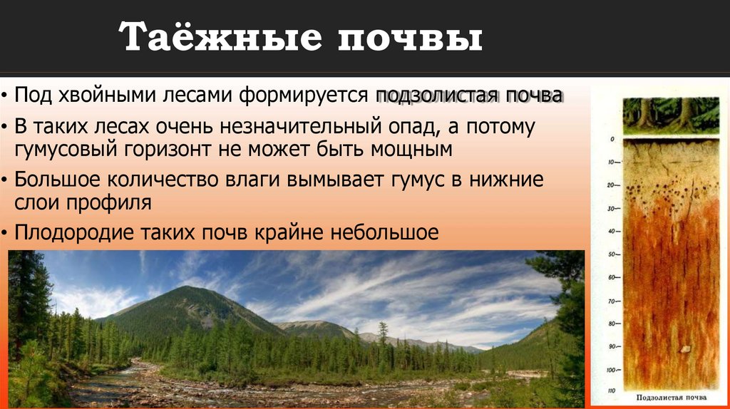 Таёжные почвы• Под хвойными лесами формируется подзолистая почва