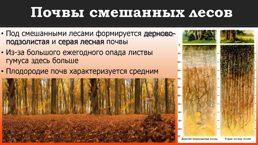 Почвы смешанных лесов• Под смешанными лесами формируется дерновоподзолистая и серая лесная почвы