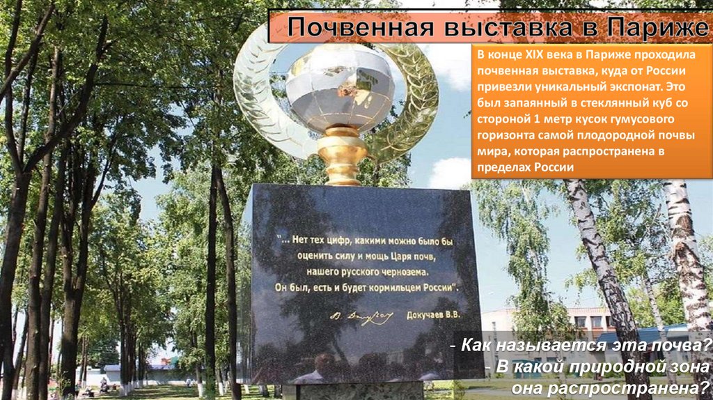 В конце XIX века в Париже проходилапочвенная выставка, куда от России