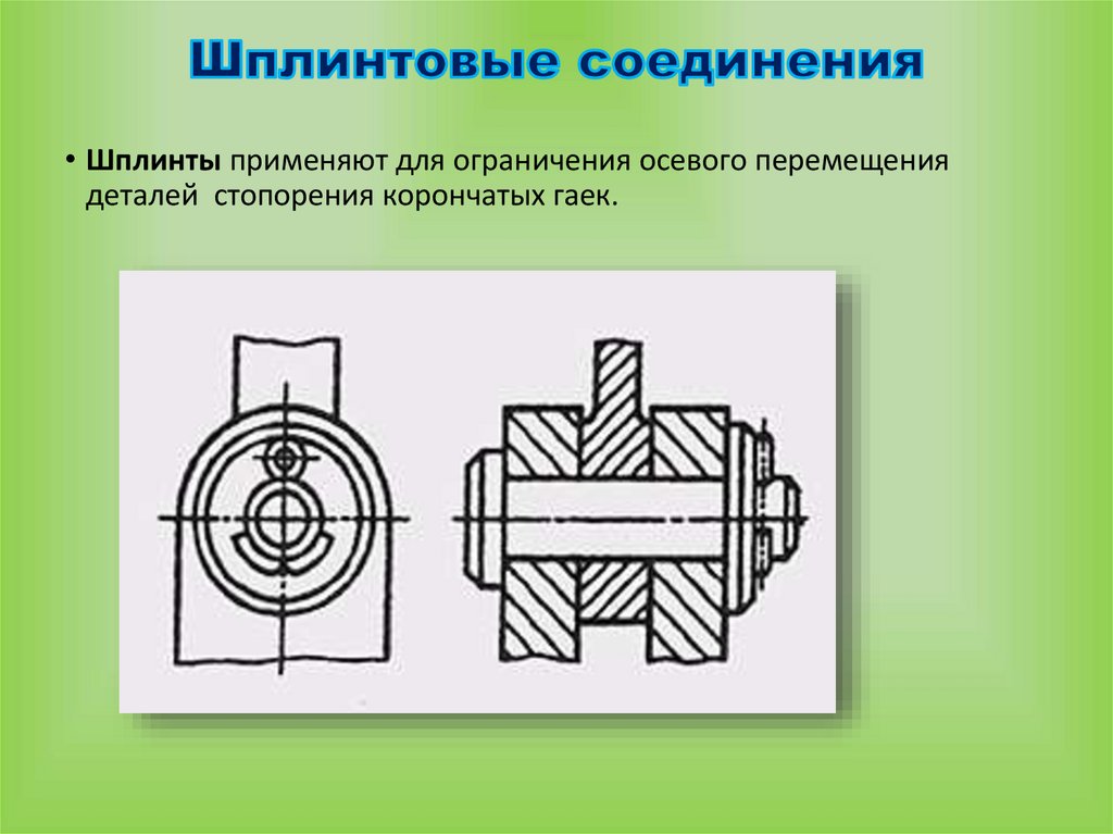 • Шплинты применяют для ограничения осевого перемещениядеталей стопорения корончатых гаек.