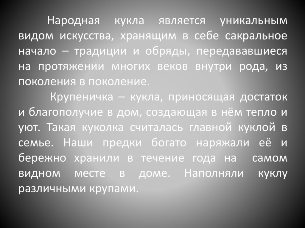 Народная кукла является уникальнымвидом искусства, хранящим в себе сакральное