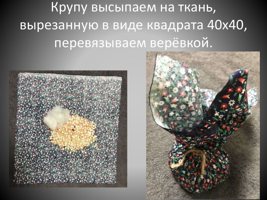 Крупу высыпаем на ткань,вырезанную в виде квадрата 40х40,
