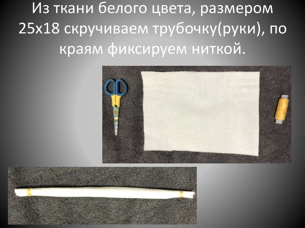 Из ткани белого цвета, размером25х18 скручиваем трубочку(руки), по