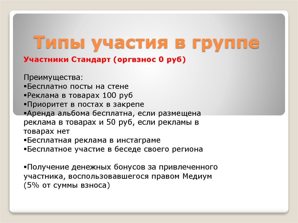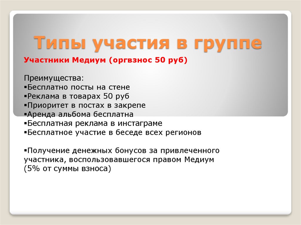 Типы участия в группеУчастники Медиум (оргвзнос 50 руб)
