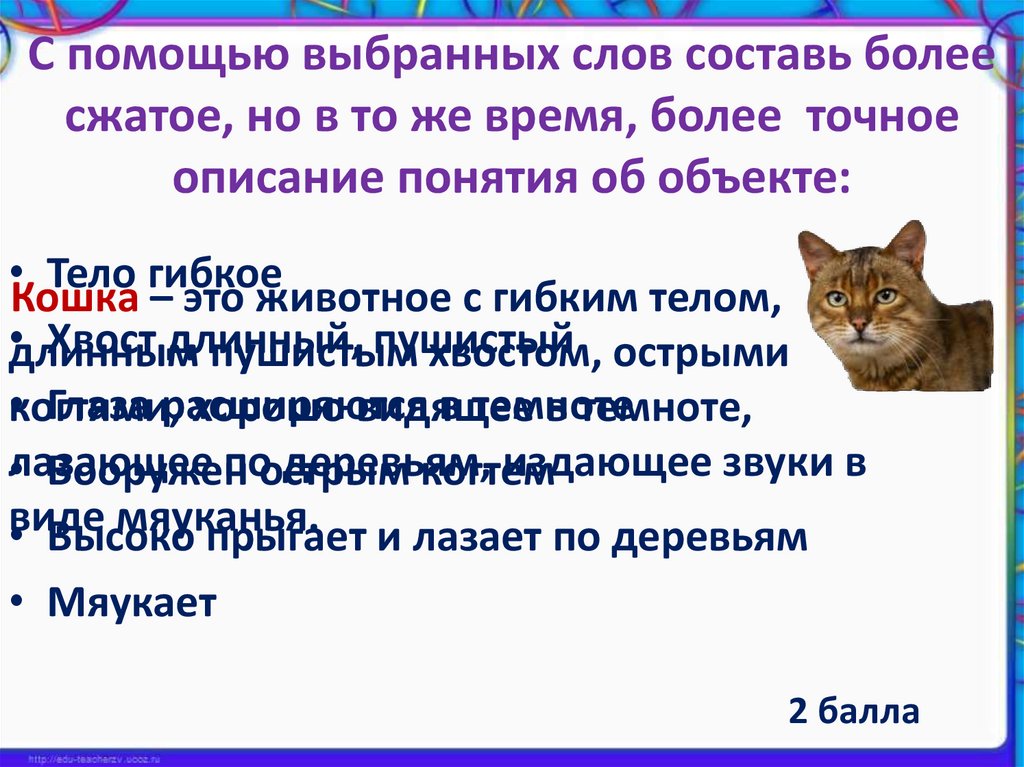 С помощью выбранных слов составь болеесжатое, но в то же время, более точное