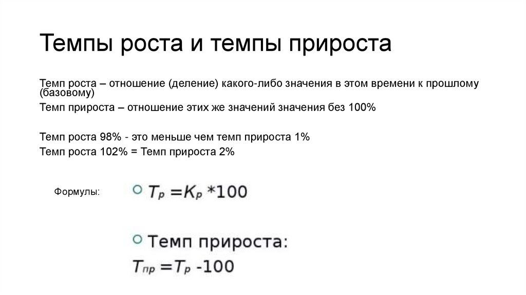 Темпы роста и темпы приростаТемп роста – отношение (деление) какого-либо значения в этом времени к прошлому