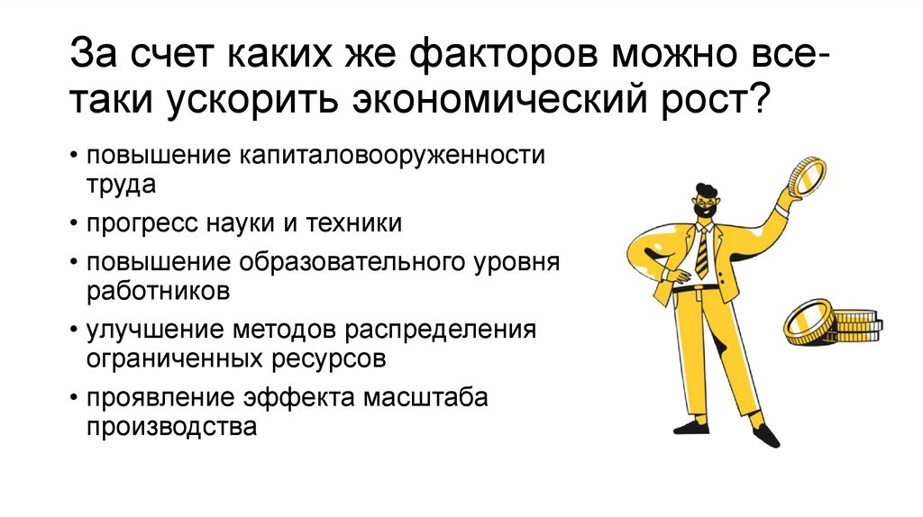 За счет каких же факторов можно всетаки ускорить экономический рост?• повышение капиталовооруженности