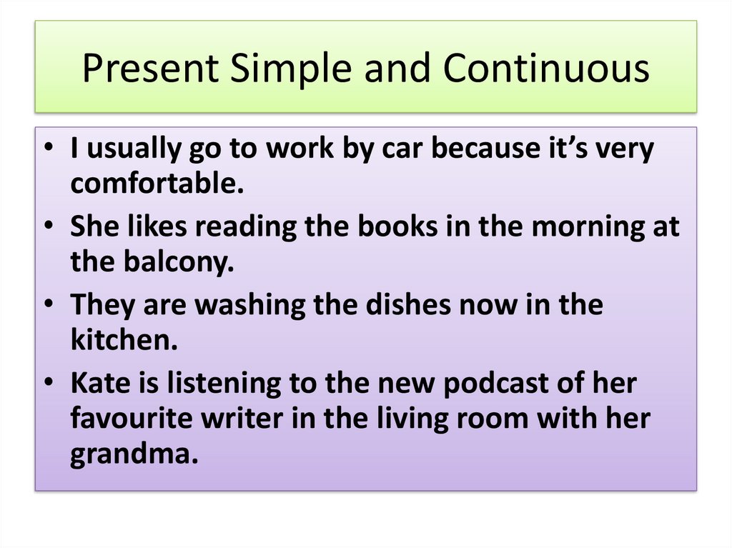 Present Simple and Continuous• I usually go to work by car because it’s very