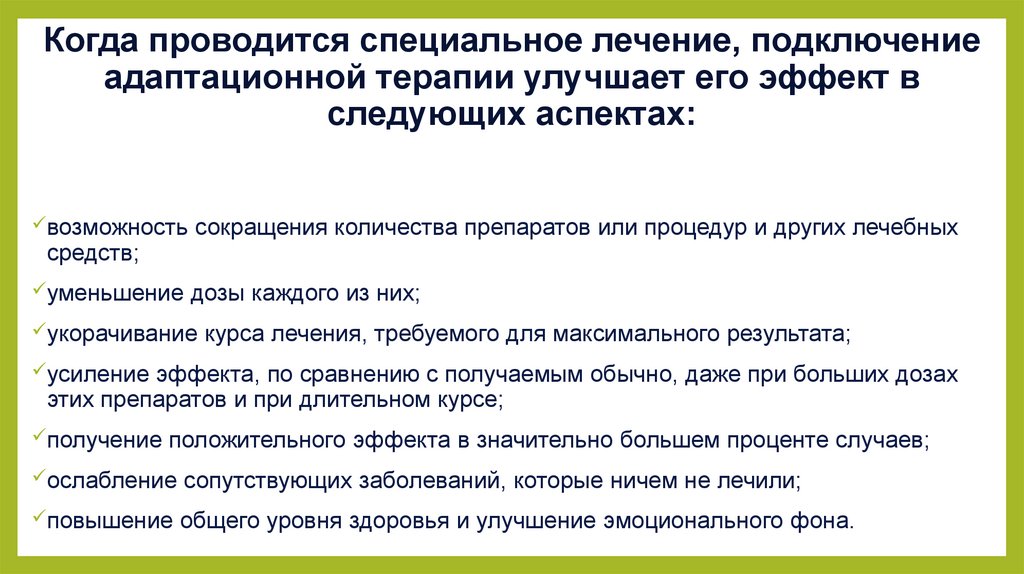 Когда проводится специальное лечение, подключениеадаптационной терапии улучшает его эффект в