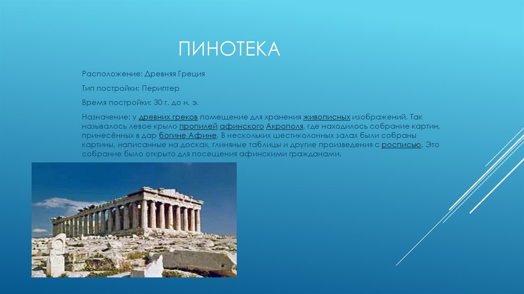 Назначение: у древних греков помещение для хранения живописных изображений. Так