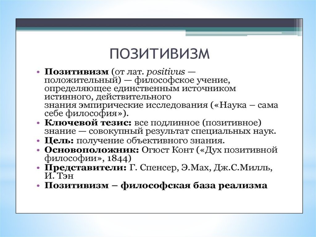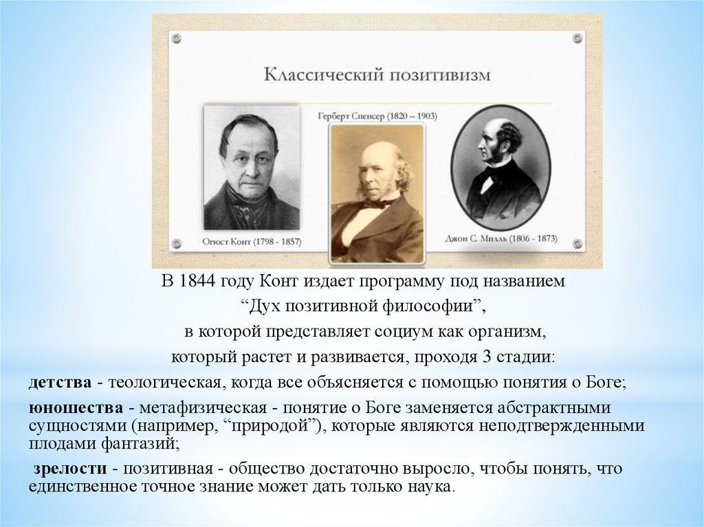 В 1844 году Конт издает программу под названием“Дух позитивной философии”,
