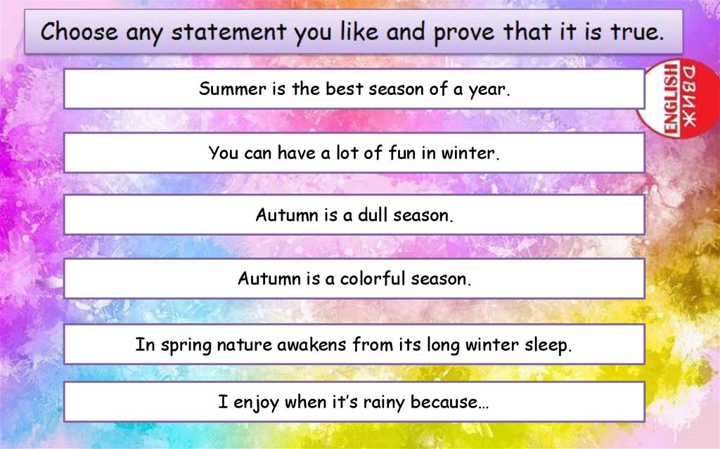 Summer is the best season of a year.You can have a lot of fun in winter.