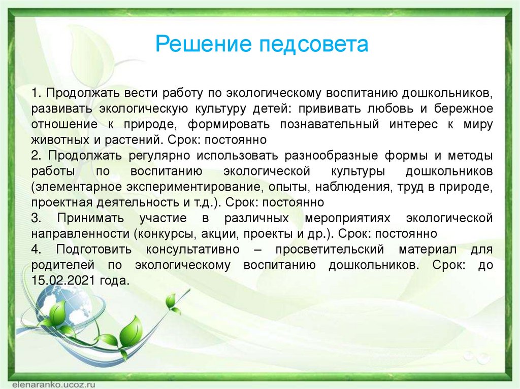 Решение педсовета1. Продолжать вести работу по экологическому воспитанию дошкольников,