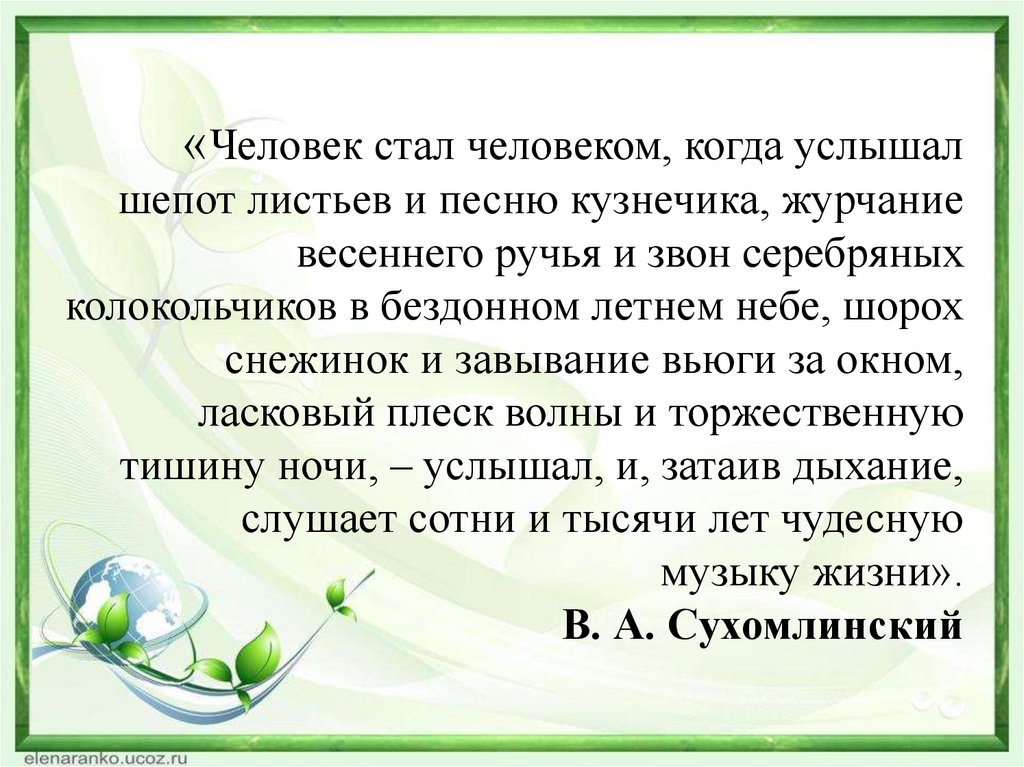 «Человек стал человеком, когда услышалшепот листьев и песню кузнечика, журчание