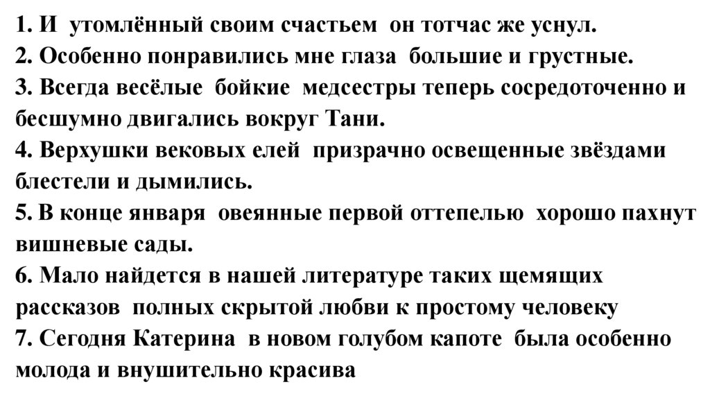 1. И утомлённый своим счастьем он тотчас же уснул.2. Особенно понравились мне глаза большие и грустные.