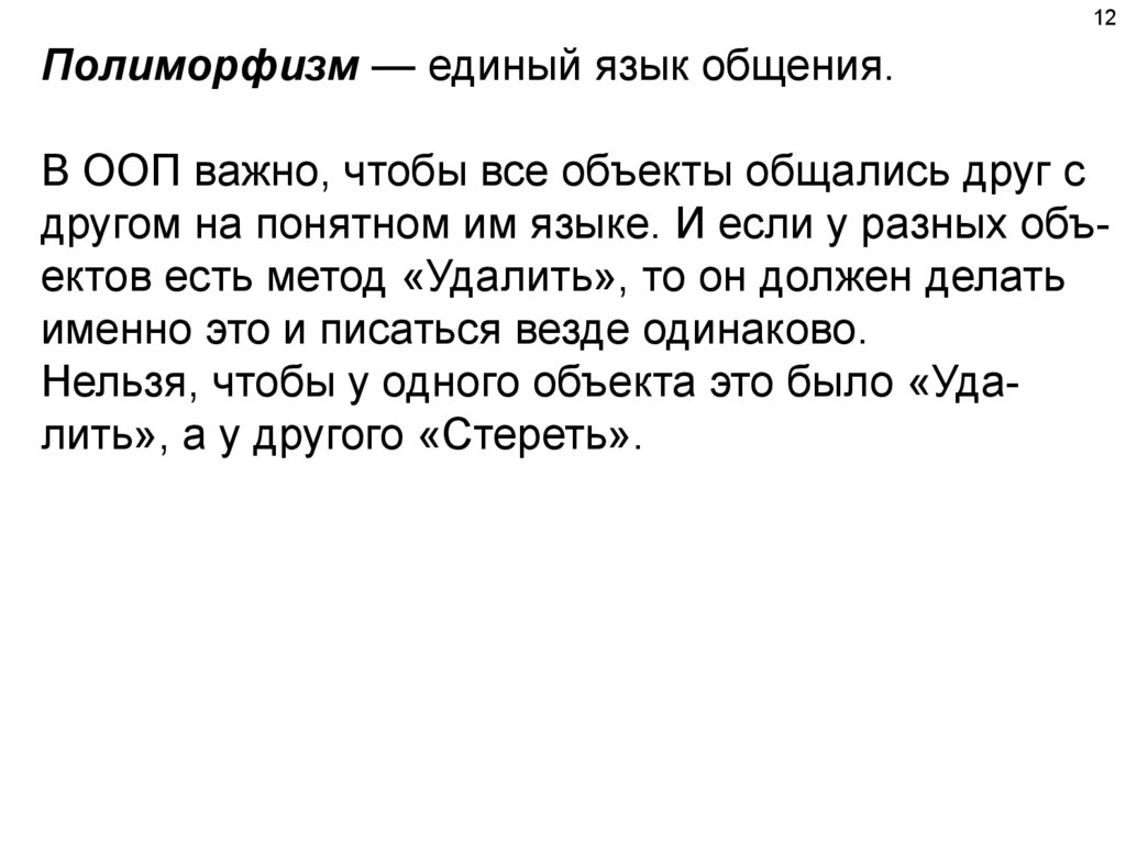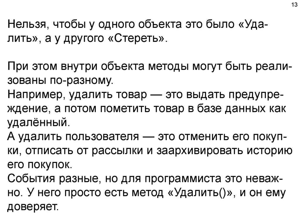 другом на понятном им языке. И если у разных объектов есть метод «Удалить», то он должен делать