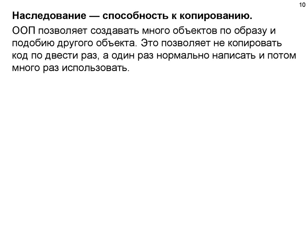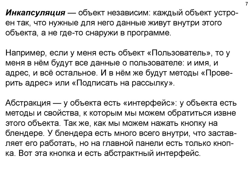 7Инкапсуляция — объект независим: каждый объект устроен так, что нужные для него данные живут внутри этого