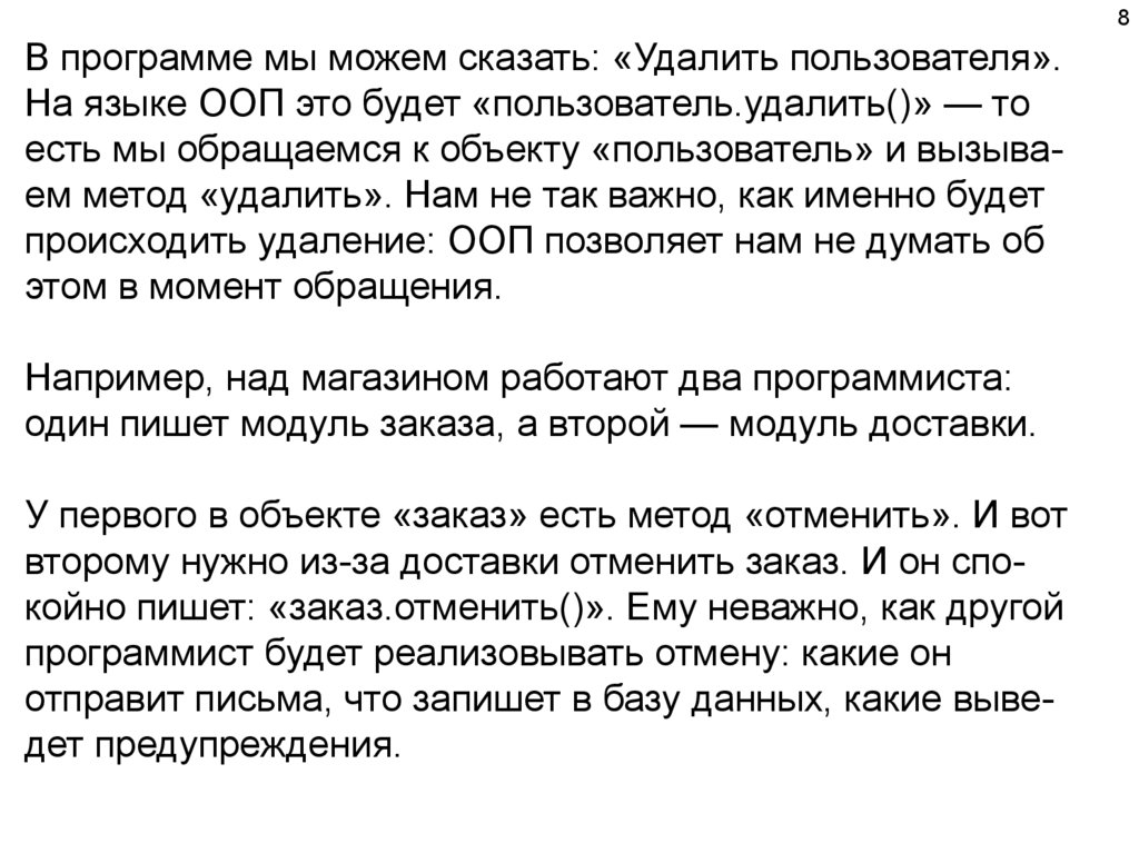 есть мы обращаемся к объекту «пользователь» и вызываем метод «удалить». Нам не так важно, как именно будет
