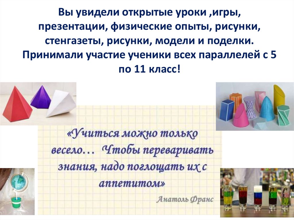 Вы увидели открытые уроки ,игры,презентации, физические опыты, рисунки,