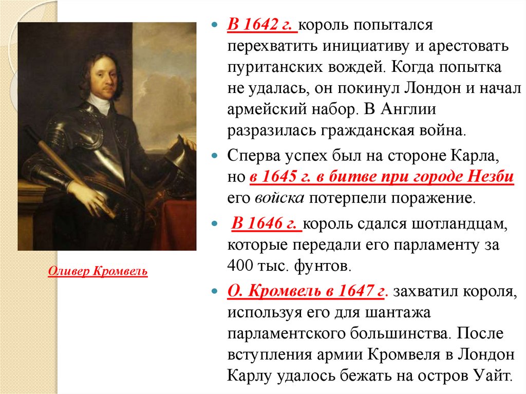 Оливер КромвельВ 1642 г. король попытался