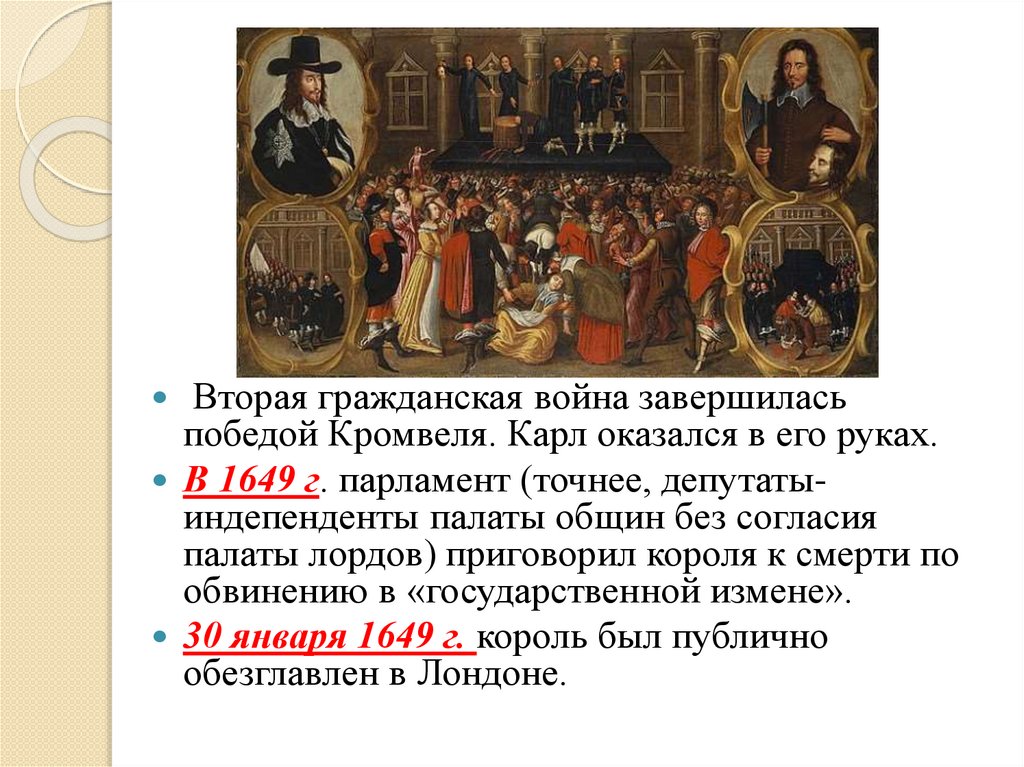 Вторая гражданская война завершиласьпобедой Кромвеля. Карл оказался в его руках.