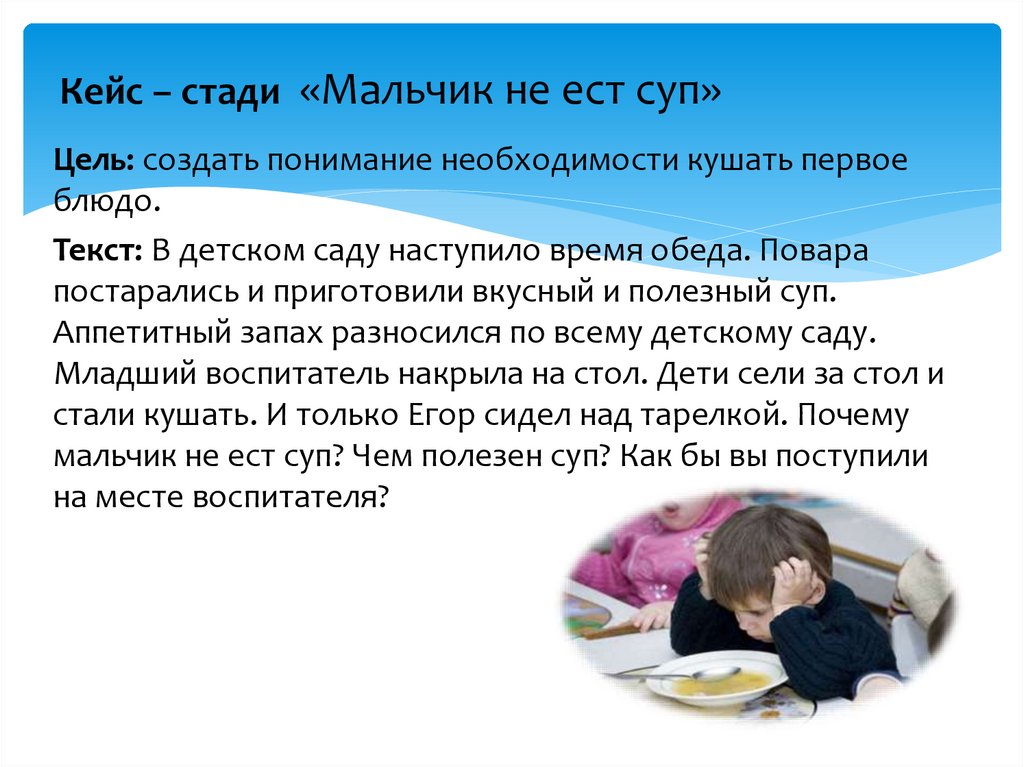 Кейс – стади «Мальчик не ест суп»Цель: создать понимание необходимости кушать первое