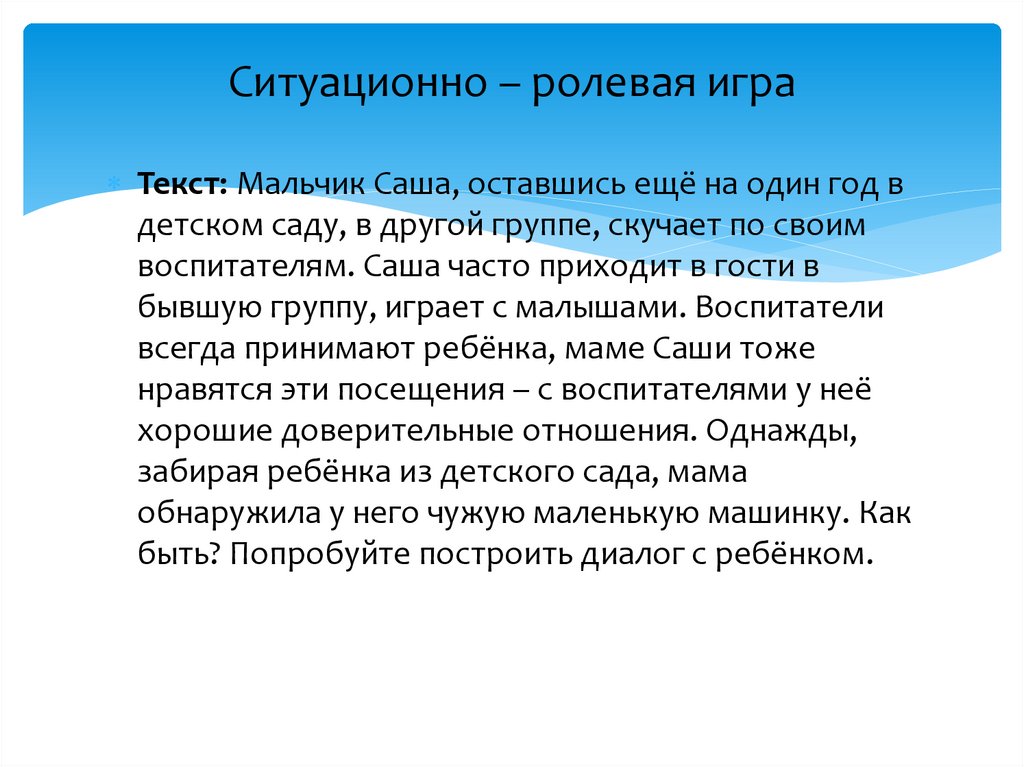 Ситуационно – ролевая играТекст: Мальчик Саша, оставшись ещё на один год в