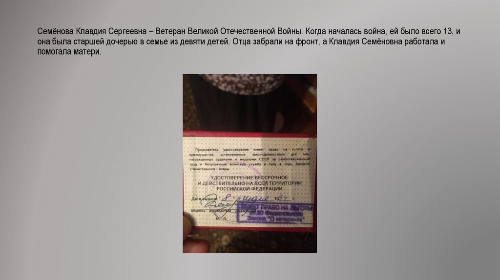 Семёнова Клавдия Сергеевна – Ветеран Великой Отечественной Войны. Когда началась война, ей было всего 13, иона была старшей дочерью в семье из девяти детей. Отца забрали на фронт, а Клавдия Семёновна работала и