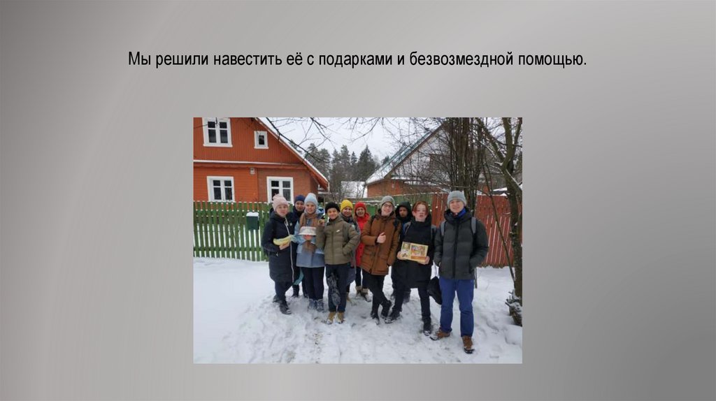 Мы решили навестить её с подарками и безвозмездной помощью.4.