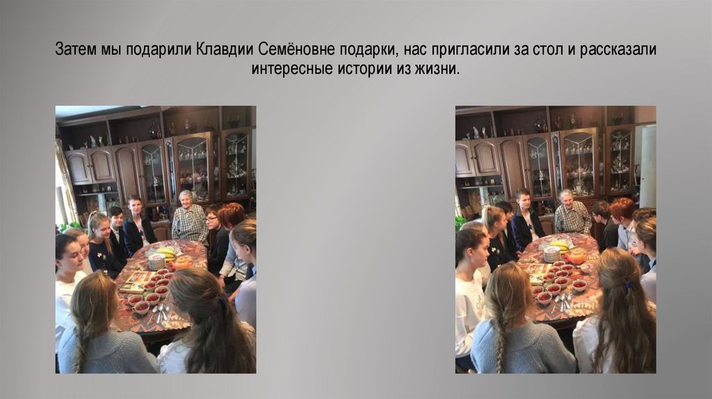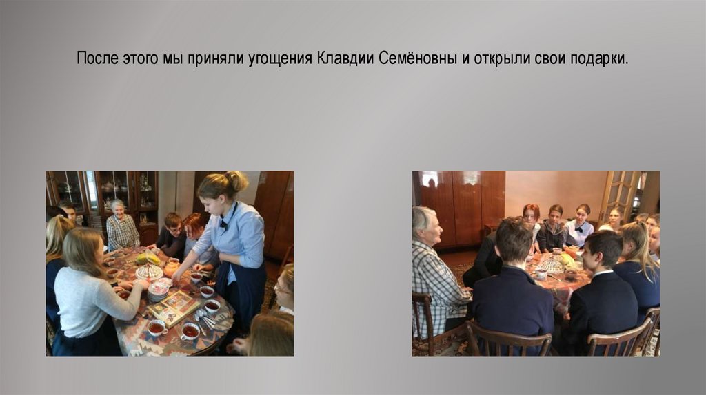 Затем мы подарили Клавдии Семёновне подарки, нас пригласили за стол и рассказалиинтересные истории из жизни.