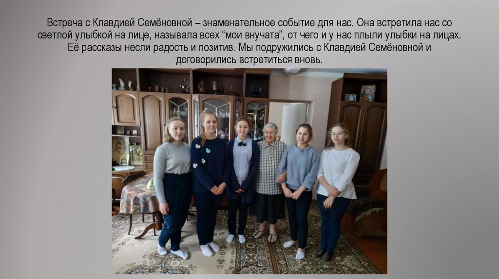 Встреча с Клавдией Семёновной – знаменательное событие для нас. Она встретила нас сосветлой улыбкой на лице, называла всех “мои внучата”, от чего и у нас плыли улыбки на лицах.