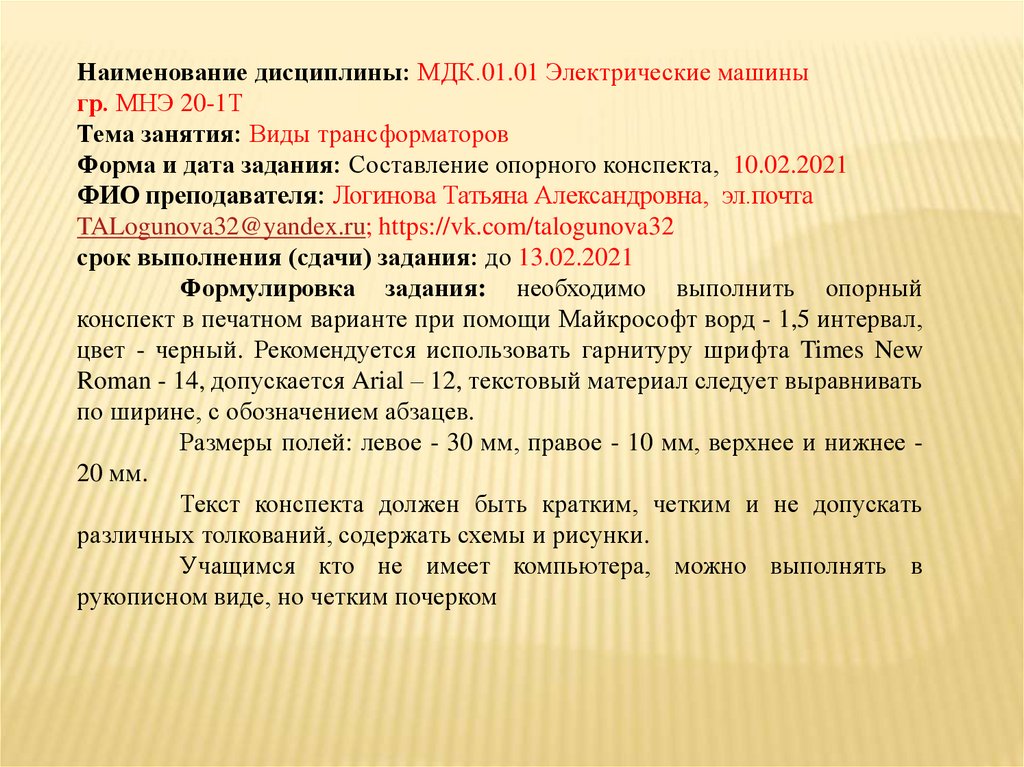 Форма и дата задания: Составление опорного конспекта, 10.02.2021