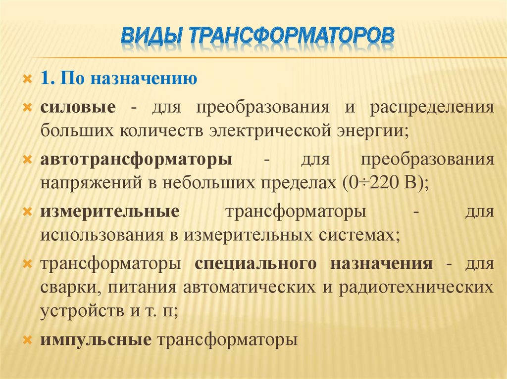 ВИДЫ ТРАНСФОРМАТОРОВ1. По назначению