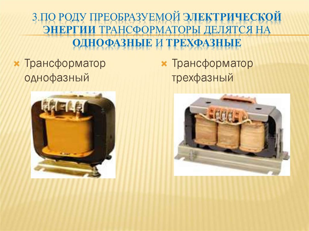 3.ПО РОДУ ПРЕОБРАЗУЕМОЙ ЭЛЕКТРИЧЕСКОЙЭНЕРГИИ ТРАНСФОРМАТОРЫ ДЕЛЯТСЯ НА